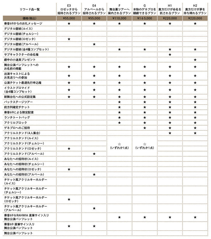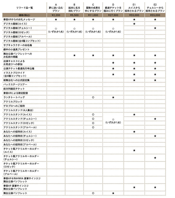 舞台化が決定した場合には、舞台に登場するサブキャラクターの命名権や舞台上の小道具のお渡しといった貴重な権利をはじめ、バックステージツアーやサイン入りパンフレットなど様々な特典をご用意していますので、ぜひご参加いただけますと幸いです。