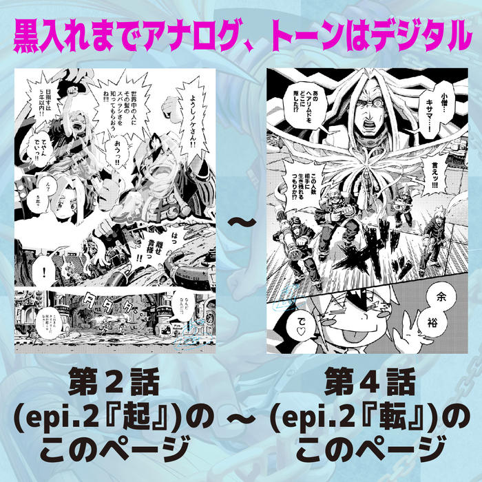 完全アナログ仕上げのページや、黒入れまでがアナログ・トーンはデジタル、オールデジタルのページがございますので、以下画像にて解説いたします。 -