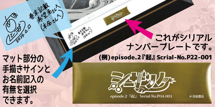 以下画像のように、マット部分のサイン(日付入)・お名前の有無を選択できます。ご購入時のアンケートにて選択してください。またお名前の希望名もご記入ください。 -