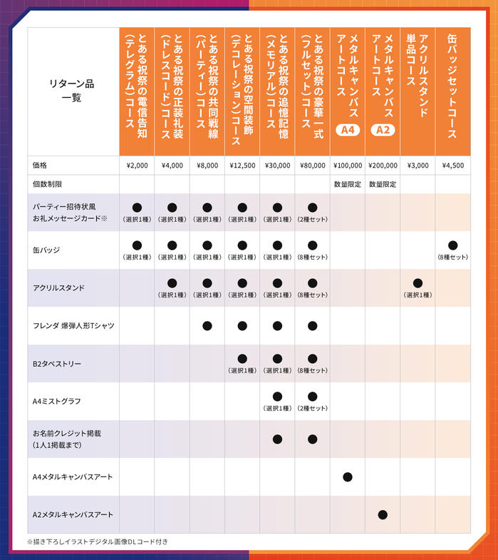 - 本プロジェクトにご参加いただく皆さまへの感謝の気持ちを込めて、本プロジェクトのために描き下ろされたイラストを使用した、ここでしか手に入らない豪華なリターン品を多数ご用意しました!